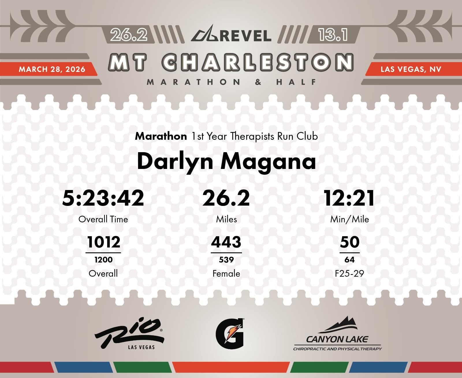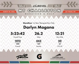 Date: March 28, 2026 Participant: Darlyn Magana #3389 Race: 2026 REVEL Mt Charleston Marathon Distance: 26.2 miles Weather: Unseasonably warm. Nice running temperatures at the start.