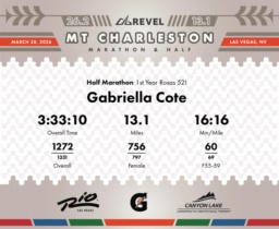 Date: March 28, 2026 Participant: Gabriella Cote #1345 Race: 2026 REVEL Mt Charleston Half Marathon Distance: 13.1 miles Weather: Unseasonably warm. Nice running temperatures at the start.