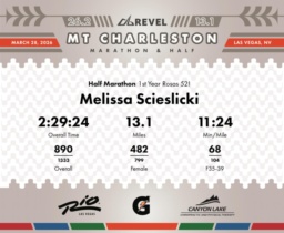Date: March 28, 2026 Participant: Melissa Scieslicki #2115 Race: 2026 REVEL Mt Charleston Half Marathon Distance: 13.1 miles Weather: Unseasonably warm. Nice running temperatures at the start.