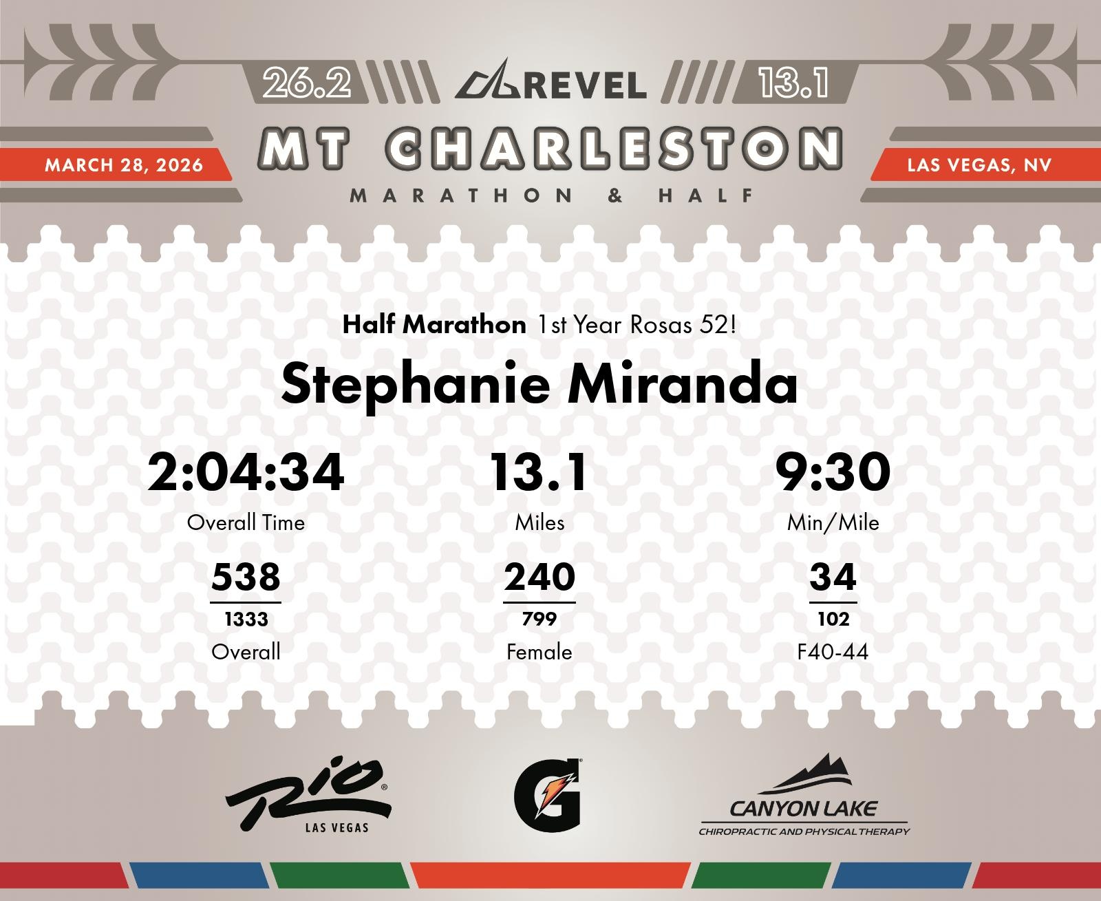 Date: March 28, 2026 Participant: Stephanie Miranda #3453 Race: 2026 REVEL Mt Charleston Half Marathon Distance: 13.1 miles Weather: Unseasonably warm. Nice running temperatures at the start.
