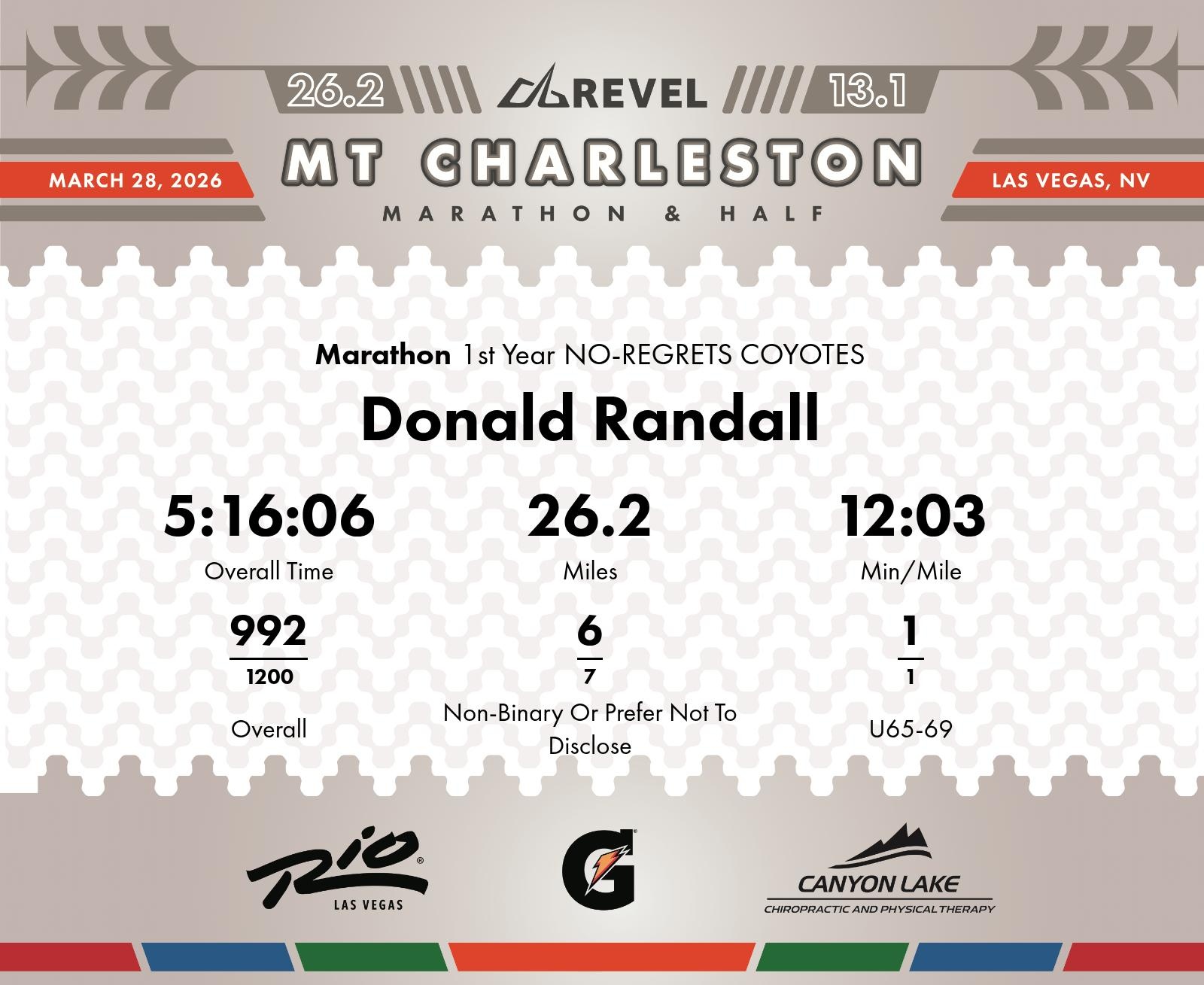 Consistent Division Leader with Key Learnings for Marathon Success Donald Randall from Edmonton displayed a strong race performance, taking 1st place in the U65-69 division at the 2026 REVEL Mt Charleston Marathon. Maintaining a consistent pace, Donald completed the marathon in 5:16:06 with an average pace of 12:03 min/mile. Throughout the race, Donald persistently held the first position in the division, showing determination and endurance. Reviewing the splits, Donald opened with a 10:58 min/mile and showed some of his fastest paces between miles 4 and 7, particularly a 9:17 min/mile at the 4th mile. The race data indicates a shift in pace in the second half, such as the 17:22 min/mile during mile 14. Working on even pacing strategy could improve the overall time. Placing 6th in the Gender Expansive category and maintaining a strong position throughout the race, Donalds performance is commendable and sets a solid foundation for future races.