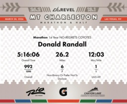 Date: March 28, 2026 Participant: Donald Randall #3639 Race: 2026 REVEL Mt Charleston Marathon Distance: 26.2 miles Weather: Unseasonably warm. Nice running temperatures at the start.