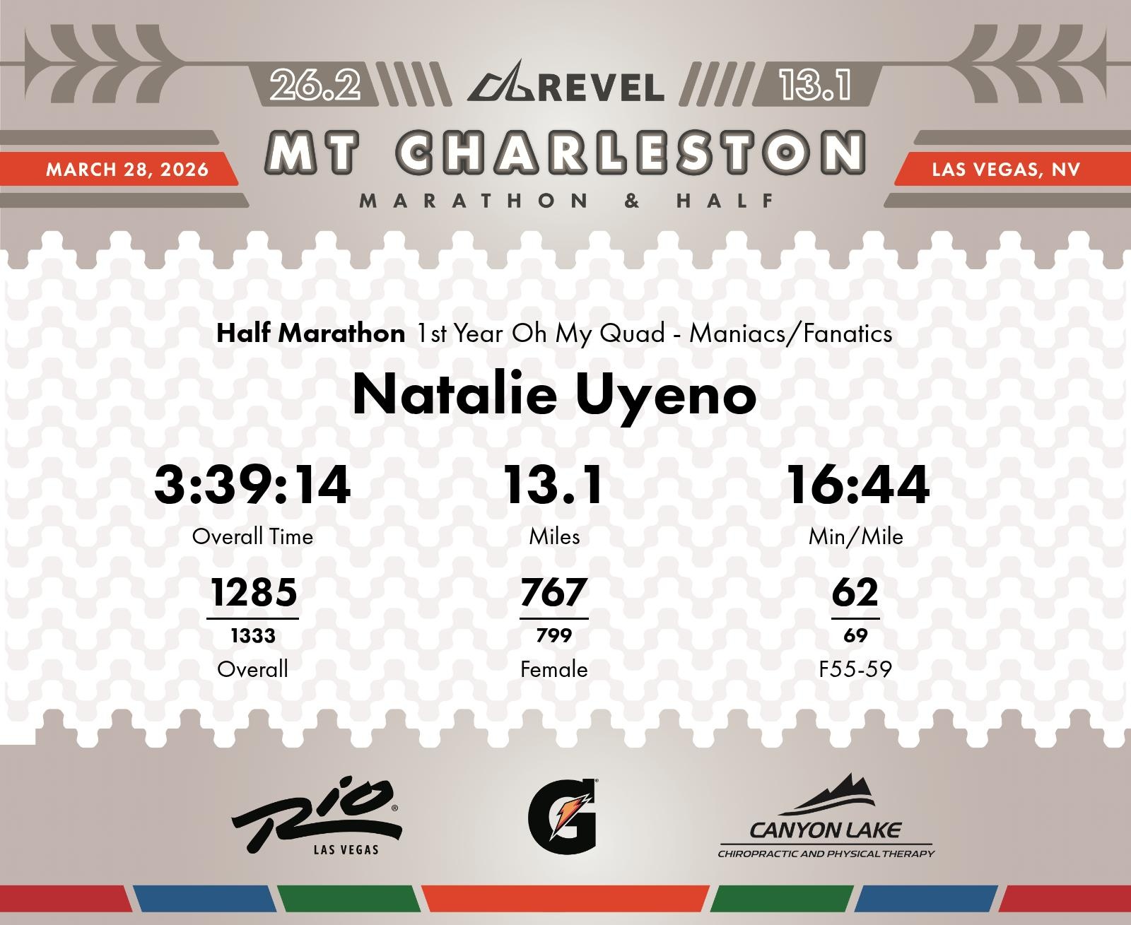 Date: March 28, 2026 Participant: Natalie Uyeno #2233 Race: 2026 REVEL Mt Charleston Half Marathon Distance: 13.1 miles Weather: Unseasonably warm. Nice running temperatures at the start.