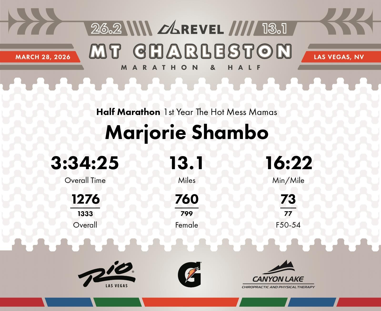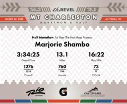 Date: March 28, 2026 Participant: Marjorie Shambo #2126 Race: 2026 REVEL Mt Charleston Half Marathon Distance: 13.1 miles Weather: Unseasonably warm. Nice running temperatures at the start.