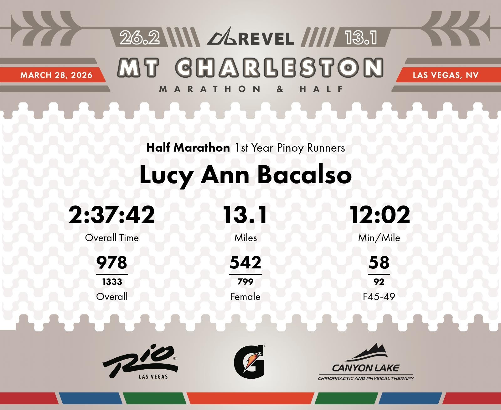 Consistent Performance with Notable Mid-Race Surge Lucy Ann Bacalso completed the 2026 REVEL Mt Charleston Half Marathon with an overall time of 2:37:42, maintaining an average pace of 12:02 min/mile. The tenacity was evident as she showed consistent performance and maintained a steady pace throughout the race, with standout achievements particularly during the 6th mile where she clocked her fastest split time of 10:52 min/mile. During the race, Lucy significantly improved her position, moving up from 1,194th place early on to 978th by the finish line. Notable improvements were seen mid-race during the 4th and 8th miles, highlighting her ability to strategically manage her energy and pacing. Analyzing the final mile, focusing on reducing the time spent may yield benefits in future races. Keep building on this strong foundation, particularly reinforcing the positive aspects noted in the middle segments of the race.