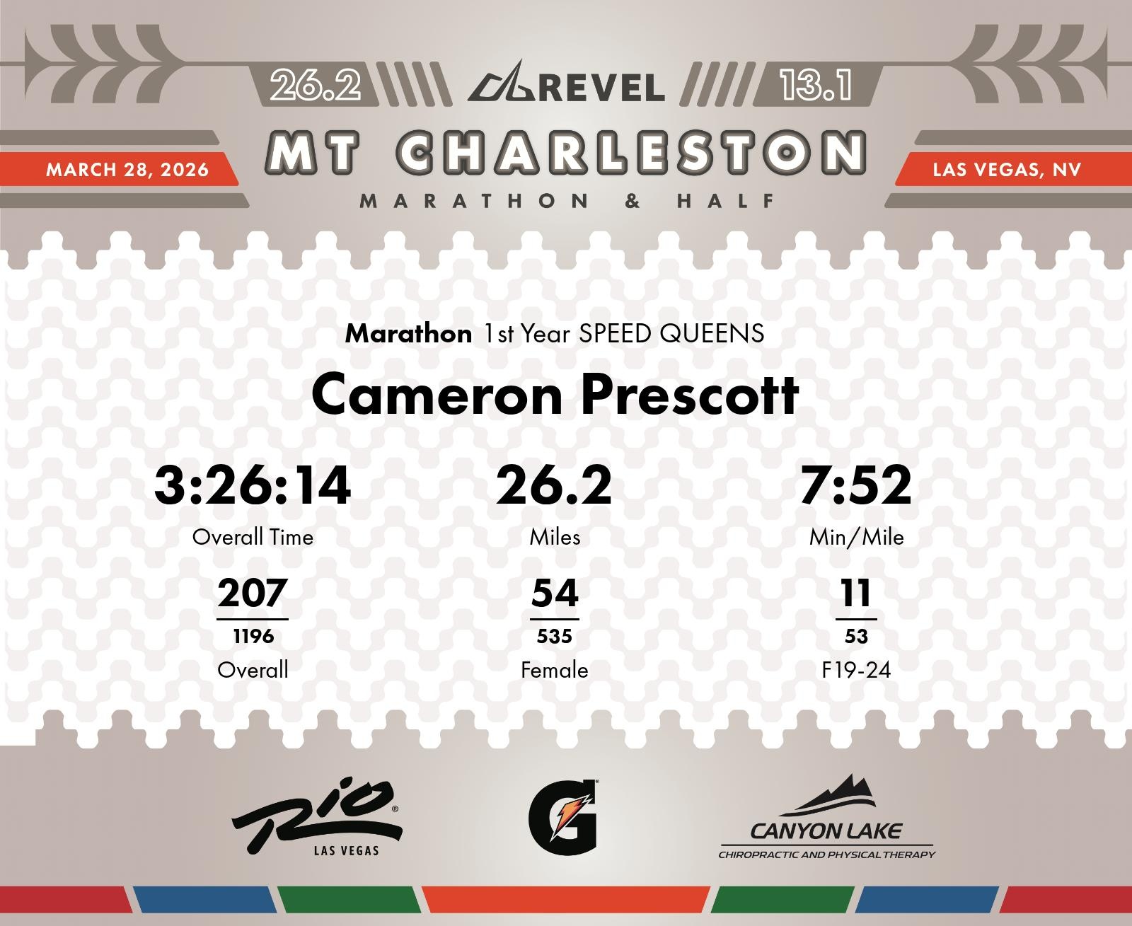 Date: March 28, 2026 Participant: Cameron Prescott #3624 Race: 2026 REVEL Mt Charleston Marathon Distance: 26.2 miles Weather: Unseasonably warm. Nice running temperatures at the start.