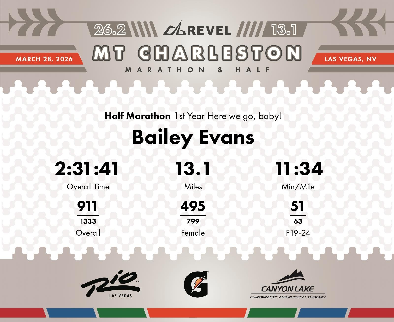 Date: March 28, 2026 Participant: Bailey Evans #1438 Race: 2026 REVEL Mt Charleston Half Marathon Distance: 13.1 miles Weather: Unseasonably warm. Nice running temperatures at the start.