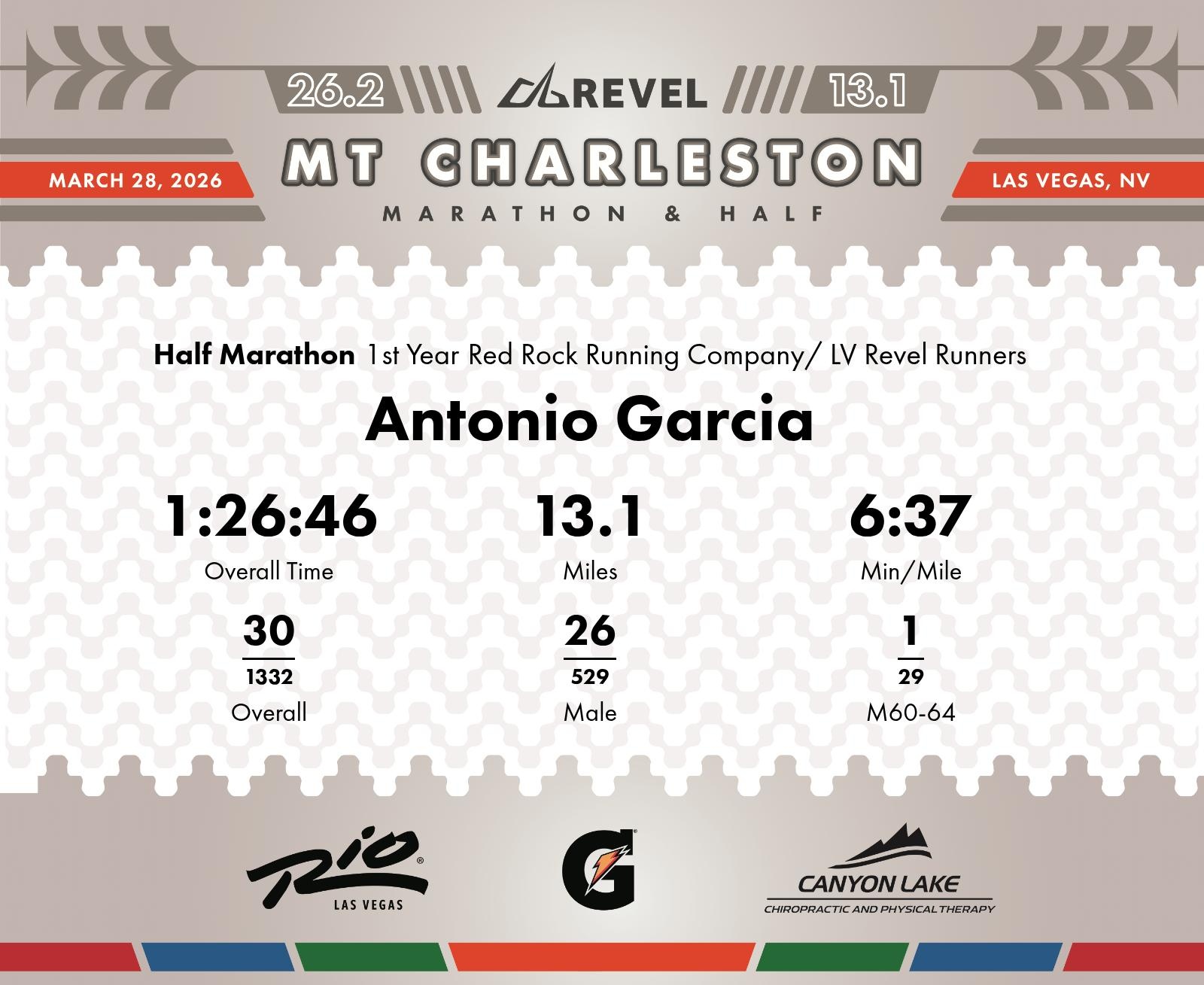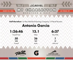 Date: March 28, 2026 Participant: Antonio Garcia #1498 Race: 2026 REVEL Mt Charleston Half Marathon Distance: 13.1 miles Weather: Unseasonably warm. Nice running temperatures at the start.
