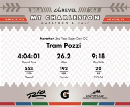 Date: March 28, 2026 Participant: Tram Pozzi #3622 Race: 2026 REVEL Mt Charleston Marathon Distance: 26.2 miles Weather: Unseasonably warm. Nice running temperatures at the start.