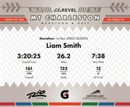 Date: March 28, 2026 Participant: Liam Smith #3789 Race: 2026 REVEL Mt Charleston Marathon Distance: 26.2 miles Weather: Unseasonably warm. Nice running temperatures at the start.