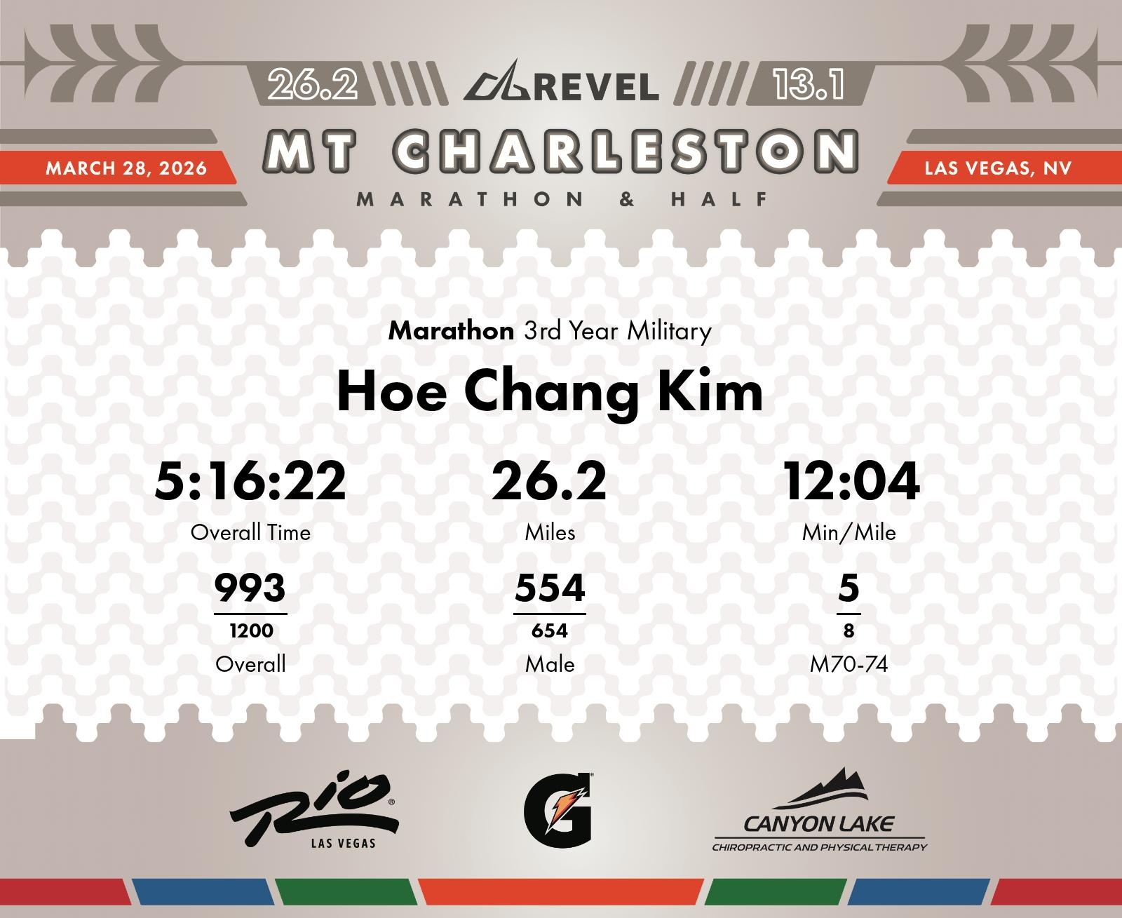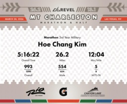 Date: March 28, 2026 Participant: Hoe Chang Kim #3291 Race: 2026 REVEL Mt Charleston Marathon Distance: 26.2 miles Weather: Unseasonably warm. Nice running temperatures at the start.