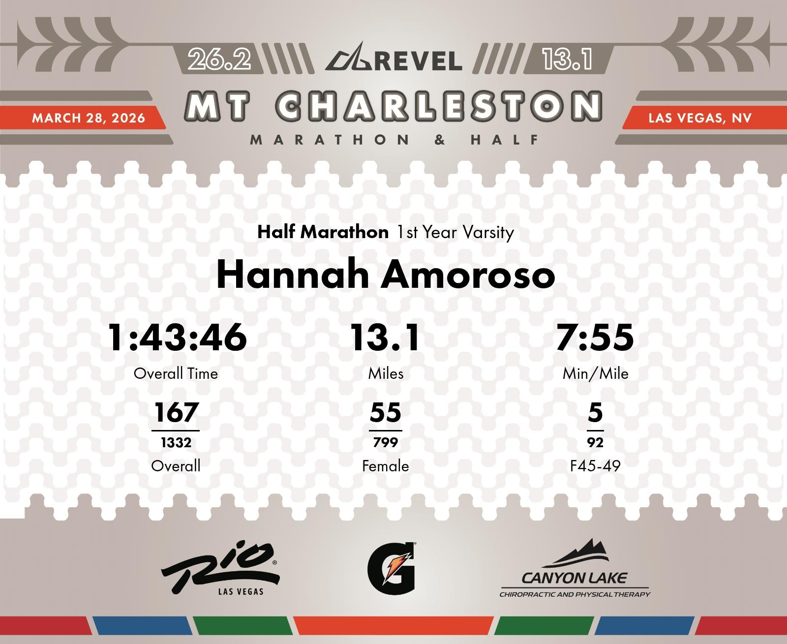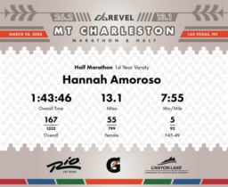 Date: March 28, 2026 Participant: Hannah Amoroso #1127 Race: 2026 REVEL Mt Charleston Half Marathon Distance: 13.1 miles Weather: Unseasonably warm. Nice running temperatures at the start.