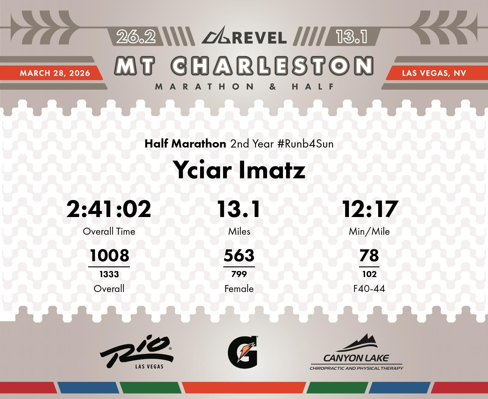 Date: March 28, 2026 Participant: Yciar Imatz #1626 Race: 2026 REVEL Mt Charleston Half Marathon Distance: 13.1 miles Weather: Unseasonably warm. Nice running temperatures at the start.