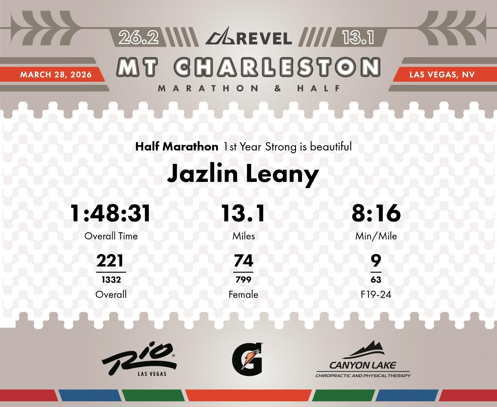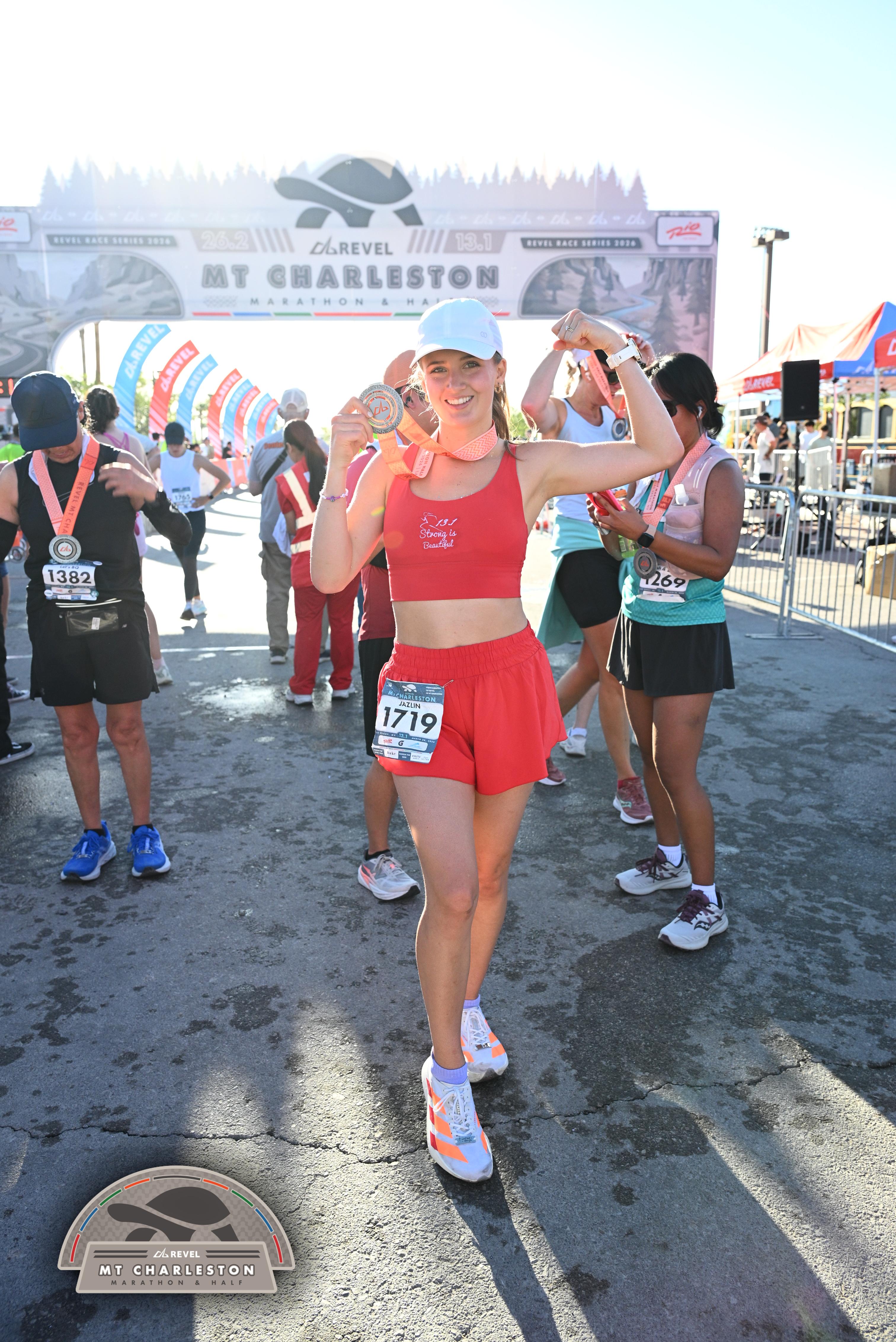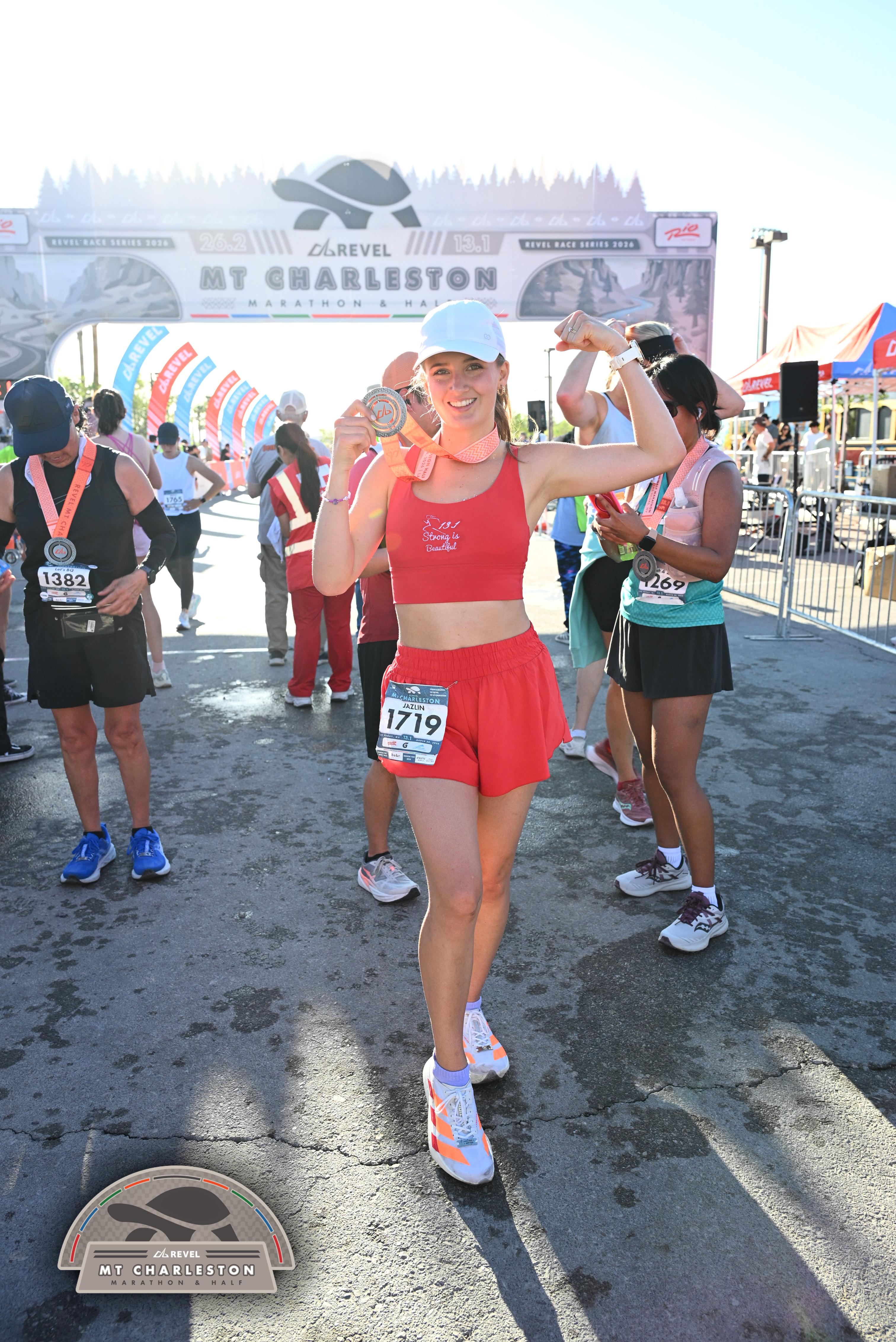 Date: March 28, 2026 Participant: Jazlin Leany #1719 Race: 2026 REVEL Mt Charleston Half Marathon Distance: 13.1 miles Weather: Unseasonably warm. Nice running temperatures at the start.