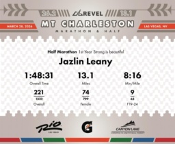 Steady Improvement: A Strong Finish Jazlin Leany displayed impressive pacing improvements during the 2026 REVEL Mt Charleston Half Marathon, finishing with an overall time of 1:48:31 and an average pace of 8:17 min/mile. Significant progress was observed in the later miles, with the final split at mile 13 executed at a pace of 7:56 min/mile. Notably, Jazlin improved her standing significantly after starting in 576th overall during the first mile, moving up to 221st by the end. Throughout the race, Jazlin demonstrated considerable performance gains in her division as well, placing 9th in the F19-24 category among 1542 total participants. After an initial split pace of 9:15 min/mile, Jazlin's pace accelerated effectively, reaching a peak speed of 7:33 min/mile at mile 4. Focusing on maintaining the pace from miles 4 to 10 could maximize future performance potential. Well done on a solid performance representing the "Strong is beautiful" team!