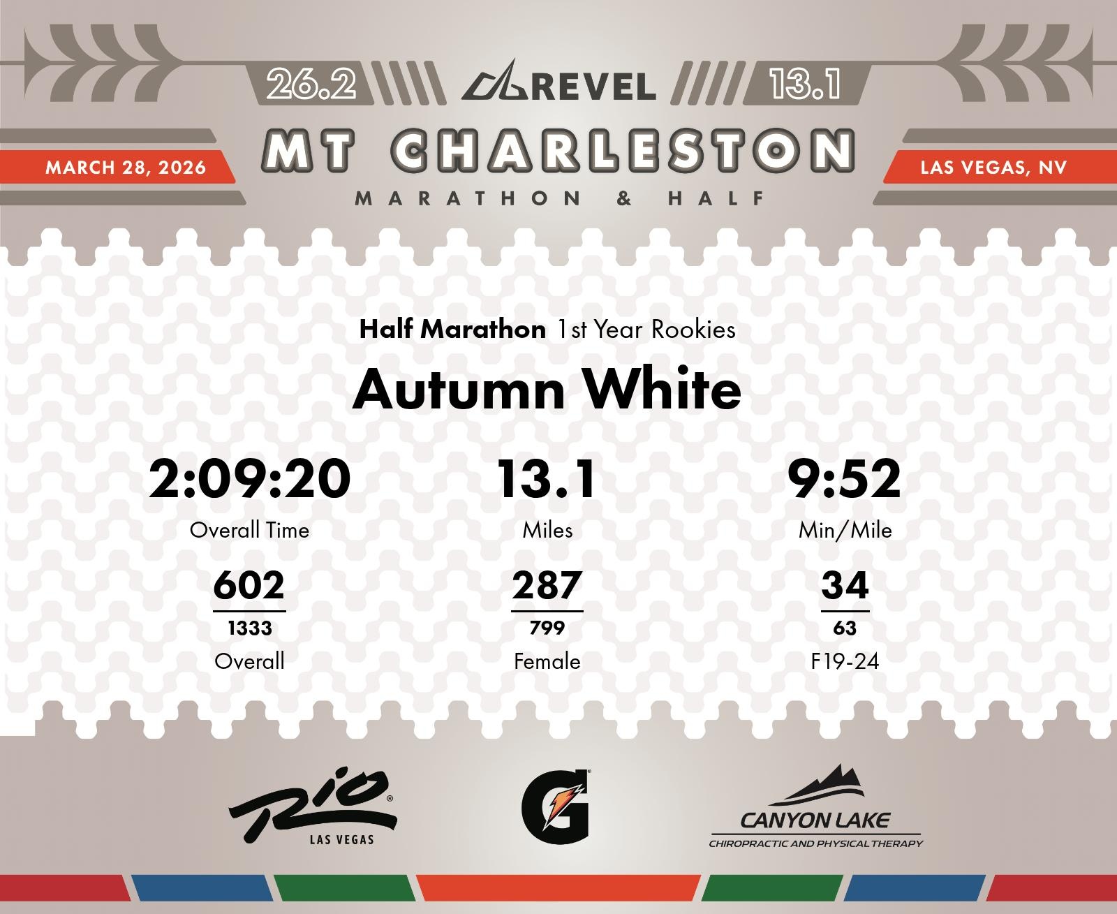 Date: March 28, 2026 Participant: Autumn White #2286 Race: 2026 REVEL Mt Charleston Half Marathon Distance: 13.1 miles Weather: Unseasonably warm. Nice running temperatures at the start.
