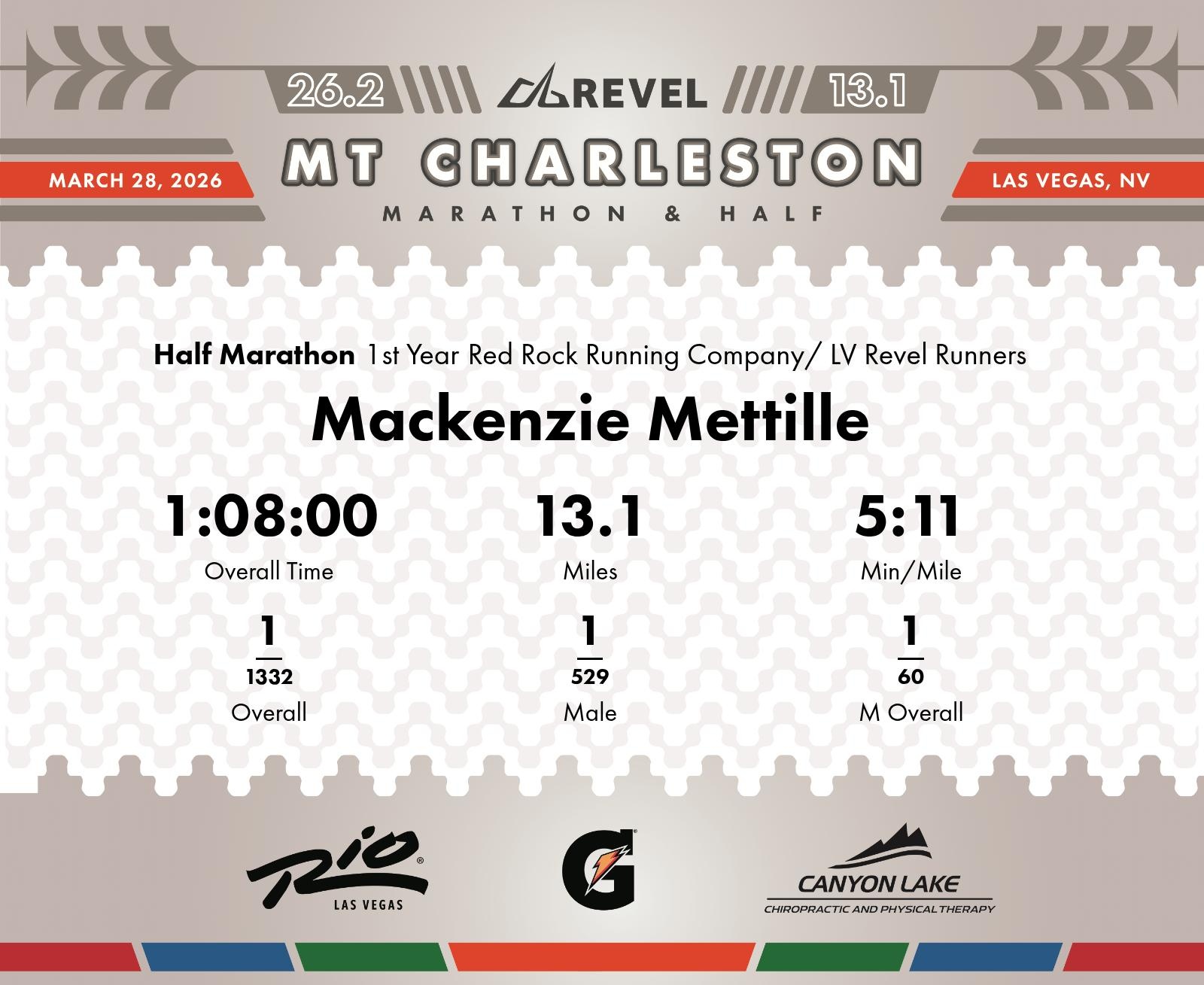 Exceptional Pace and Consistency Lead to an Outstanding Finish Mackenzie Mettille commendably secured his position at the top during the 2026 REVEL Mt Charleston Half Marathon, running 13.1 miles in an impressive 1:08:00. Across the duration of the race, Mettille maintained an exemplary average pace of 5:11 min/mile. Particularly remarkable were several splits, including the first mile clocked at 4:49 min/mile and the fourth mile, a swift 4:56 min/mile effort, showcasing consistent top-speed capability. Throughout each mile marker, Mettille demonstrated unwavering leadership, consistently placing first in overall, gender, and division rankings. His strong kick in the final miles proved his endurance and strategic race management, with late miles like the thirteenth completed at 5:15 min/mile. Mackenzie's performance highlights his ability to blend speed and stamina effectively. Joining the Red Rock Running Company/ LV Revel Runners, Mettille set a high standard in a competitive field of 1,542 participants.