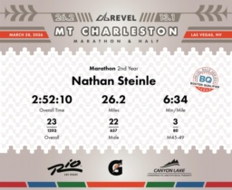 Date: March 28, 2026 Participant: Nathan Steinle #2693 Race: 2026 REVEL Mt Charleston Marathon Distance: 26.2 miles Weather: Unseasonably warm. Nice running temperatures at the start.