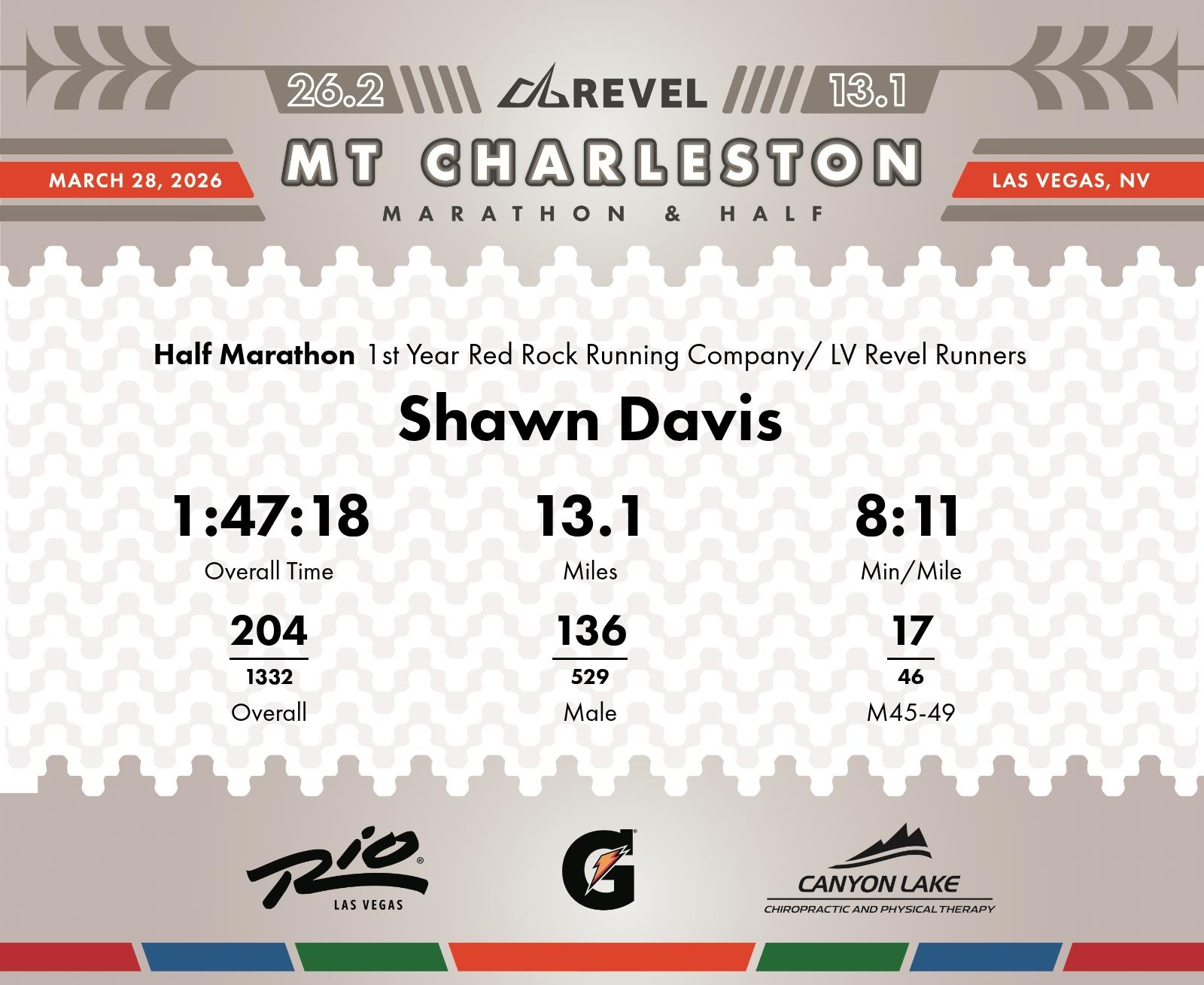 Date: March 28, 2026 Participant: Shawn Davis #4287 Race: 2026 REVEL Mt Charleston Half Marathon Distance: 13.1 miles Weather: Unseasonably warm. Nice running temperatures at the start.