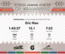 Date: March 28, 2026 Participant: Eric Han #1570 Race: 2026 REVEL Mt Charleston Half Marathon Distance: 13.1 miles Weather: Unseasonably warm. Nice running temperatures at the start.