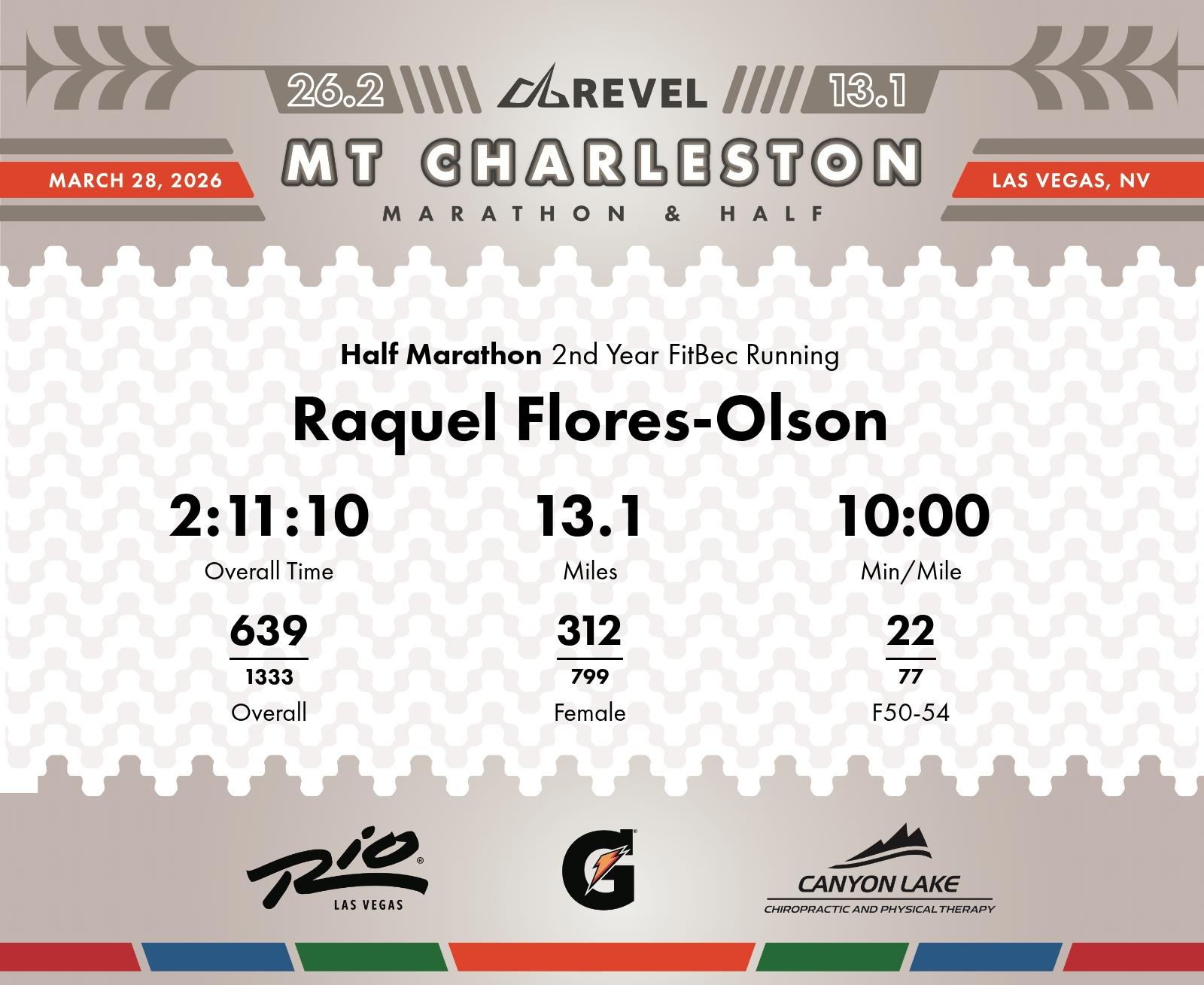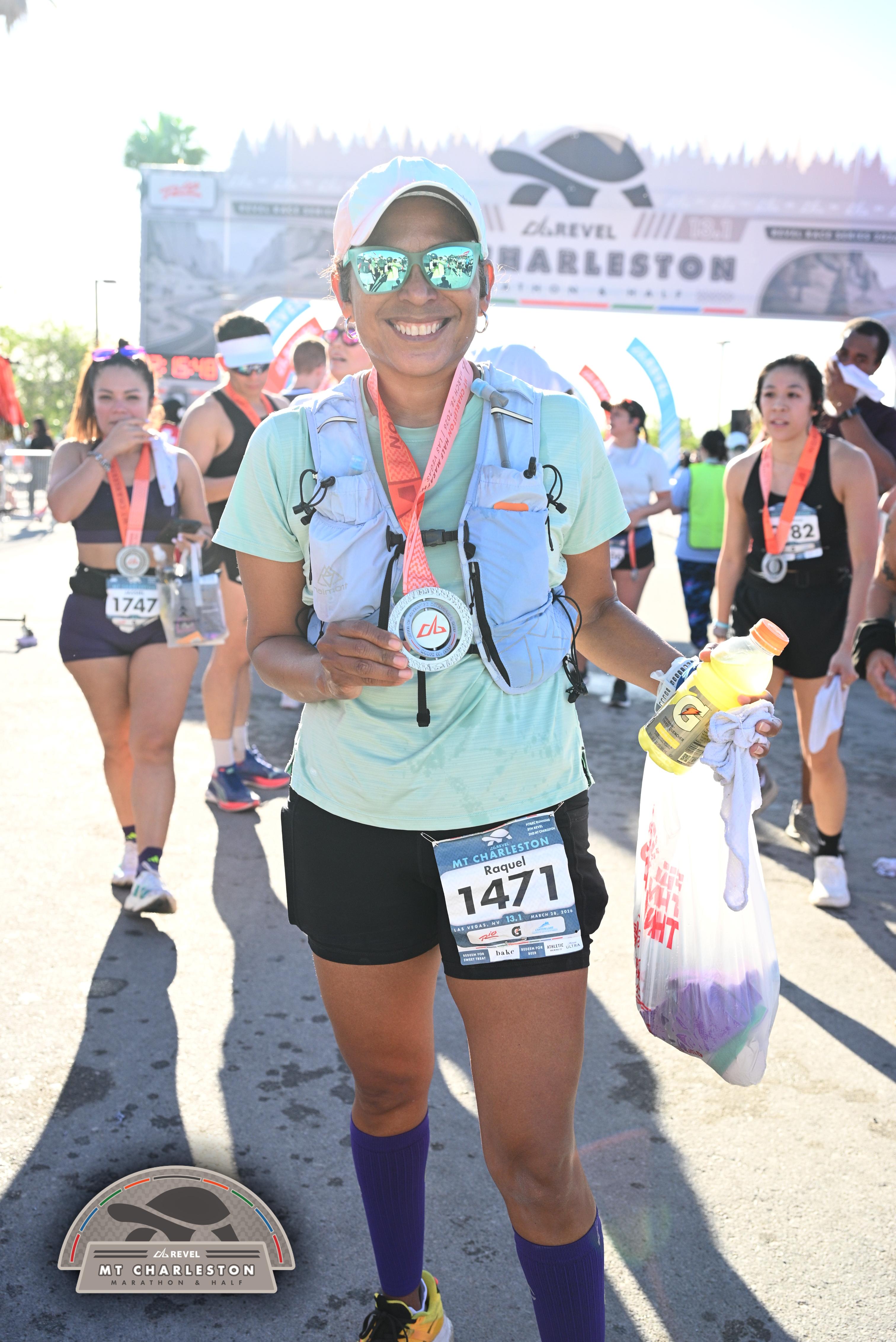 Date: March 28, 2026 Participant: Raquel Flores-Olson #1471 Race: 2026 REVEL Mt Charleston Half Marathon Distance: 13.1 miles Weather: Unseasonably warm. Nice running temperatures at the start.