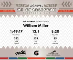 Date: March 28, 2026 Participant: William Miller #1865 Race: 2026 REVEL Mt Charleston Half Marathon Distance: 13.1 miles Weather: Unseasonably warm. Nice running temperatures at the start.