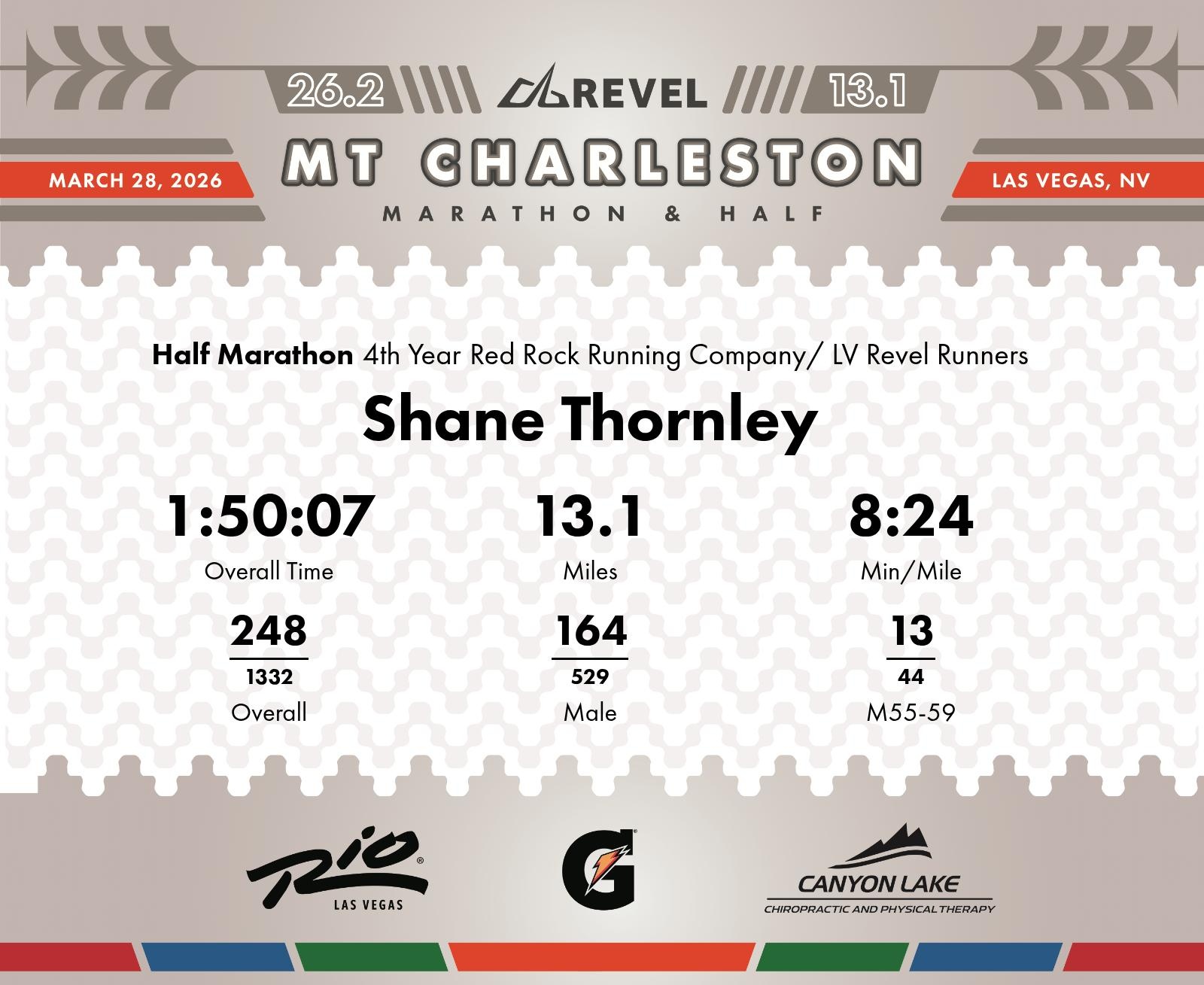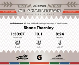 Date: March 28, 2026 Participant: Shane Thornley #2204 Race: 2026 REVEL Mt Charleston Half Marathon Distance: 13.1 miles Weather: Unseasonably warm. Nice running temperatures at the start.