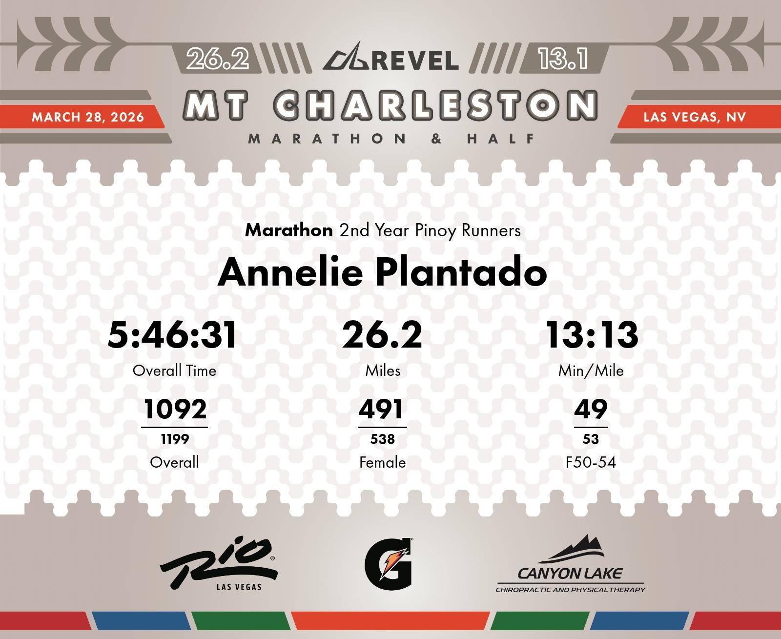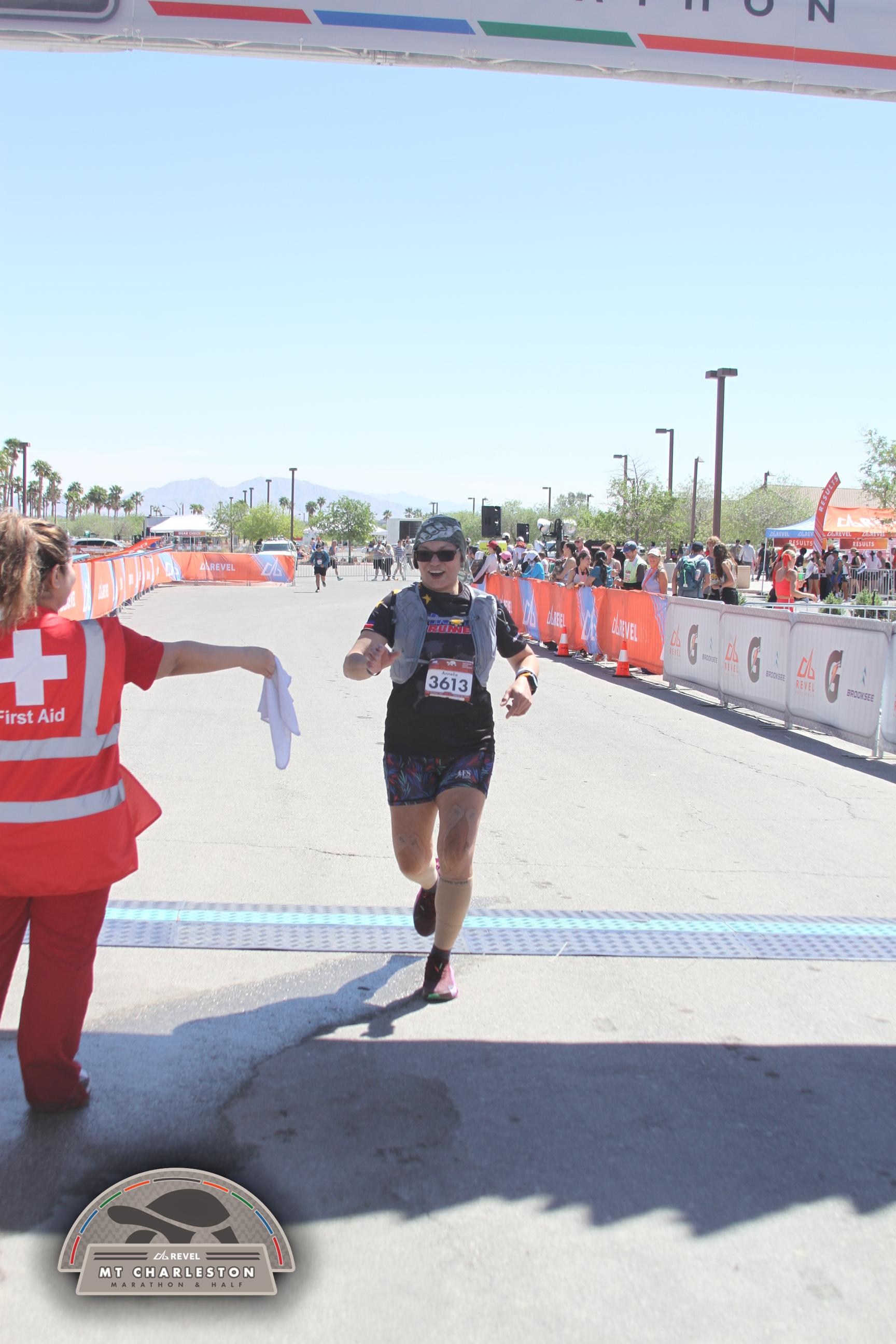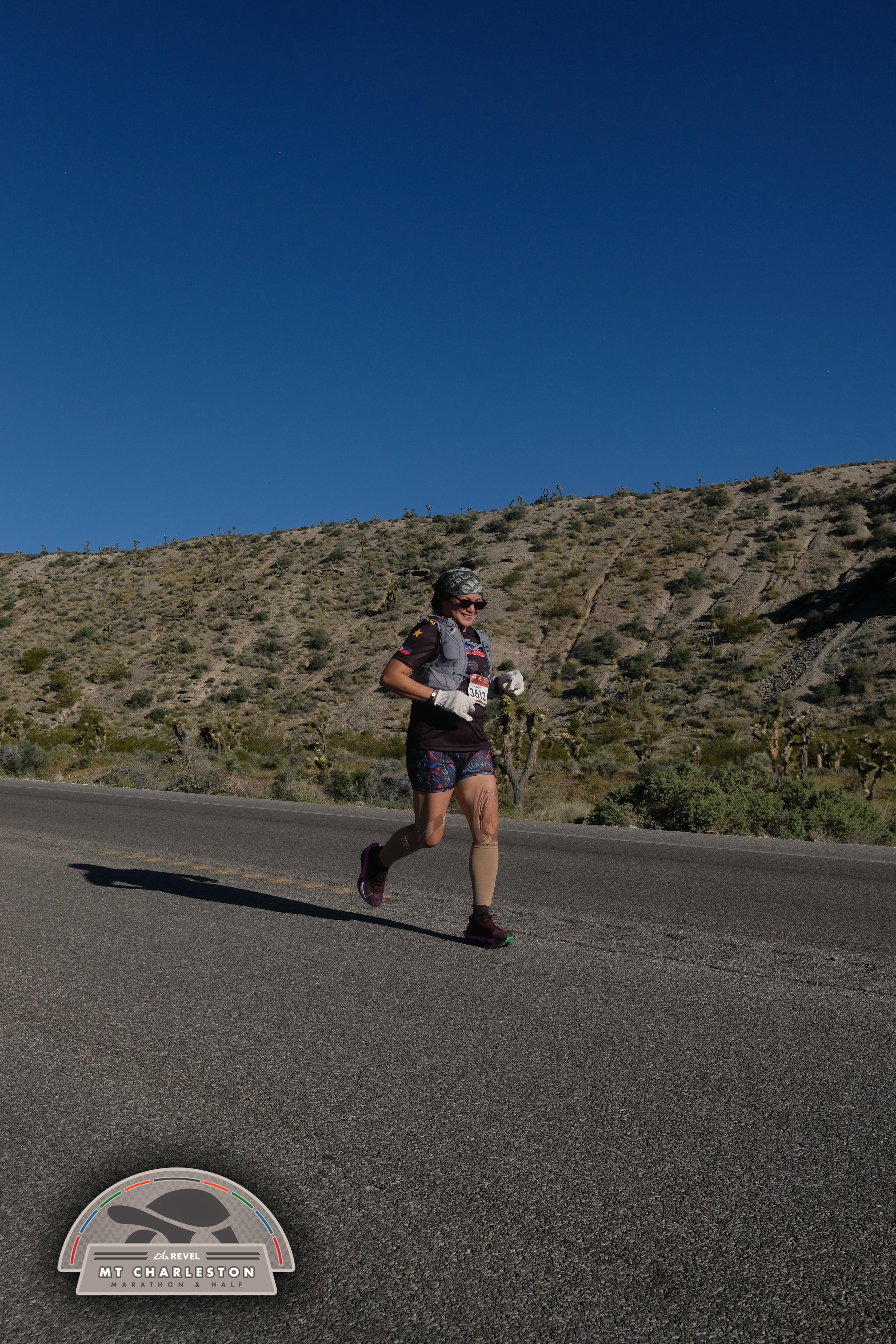 Date: March 28, 2026 Participant: Annelie Plantado #3613 Race: 2026 REVEL Mt Charleston Marathon Distance: 26.2 miles Weather: Unseasonably warm. Nice running temperatures at the start.