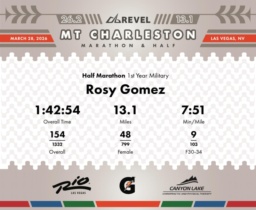 Smooth Start, Consistent Finish Rosy Gomez maintained a steady pace in the 2026 REVEL Mt Charleston Half Marathon, achieving an average pace of 7:51 min/mile. Her splits indicate a strong start, clocking in her fastest mile at 7:15 in mile 4. This early momentum contributed to a solid race overall. Notably, Gomez finished with an impressive 48th position in her gender category, among 1,542 participants. Gomez's strategic pacing shone through most of the race, though she might consider focusing on energy conservation in the latter stages. Her performance was consistent, particularly between miles 8 to 13, where slight pace variations occurred but did not compromise her overall race time of 1:42:54. Her efforts led her to finish 9th in her division, a remarkable achievement reflecting her dedication and training. Congratulations on representing Team Military with determination and skill.