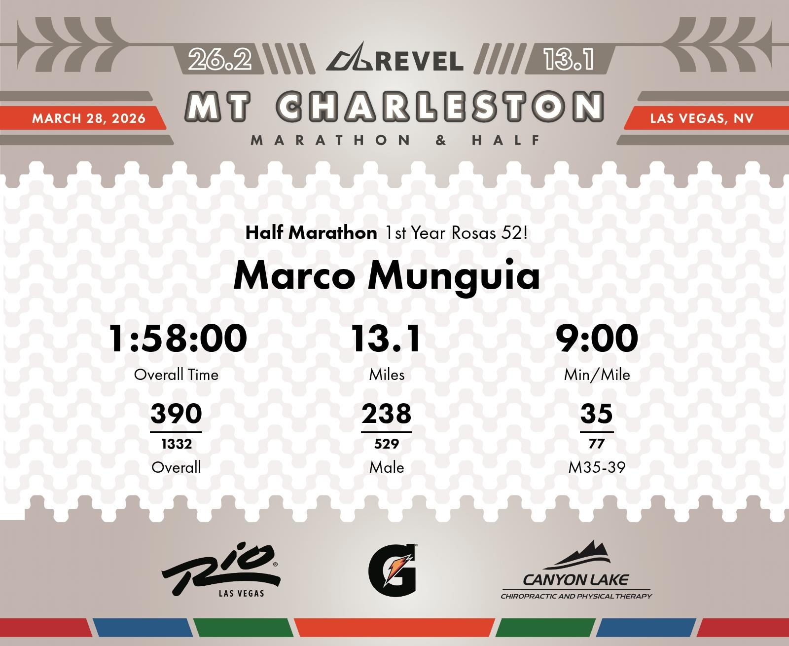 Date: March 28, 2026 Participant: Marco Munguia #4372 Race: 2026 REVEL Mt Charleston Half Marathon Distance: 13.1 miles Weather: Unseasonably warm. Nice running temperatures at the start.