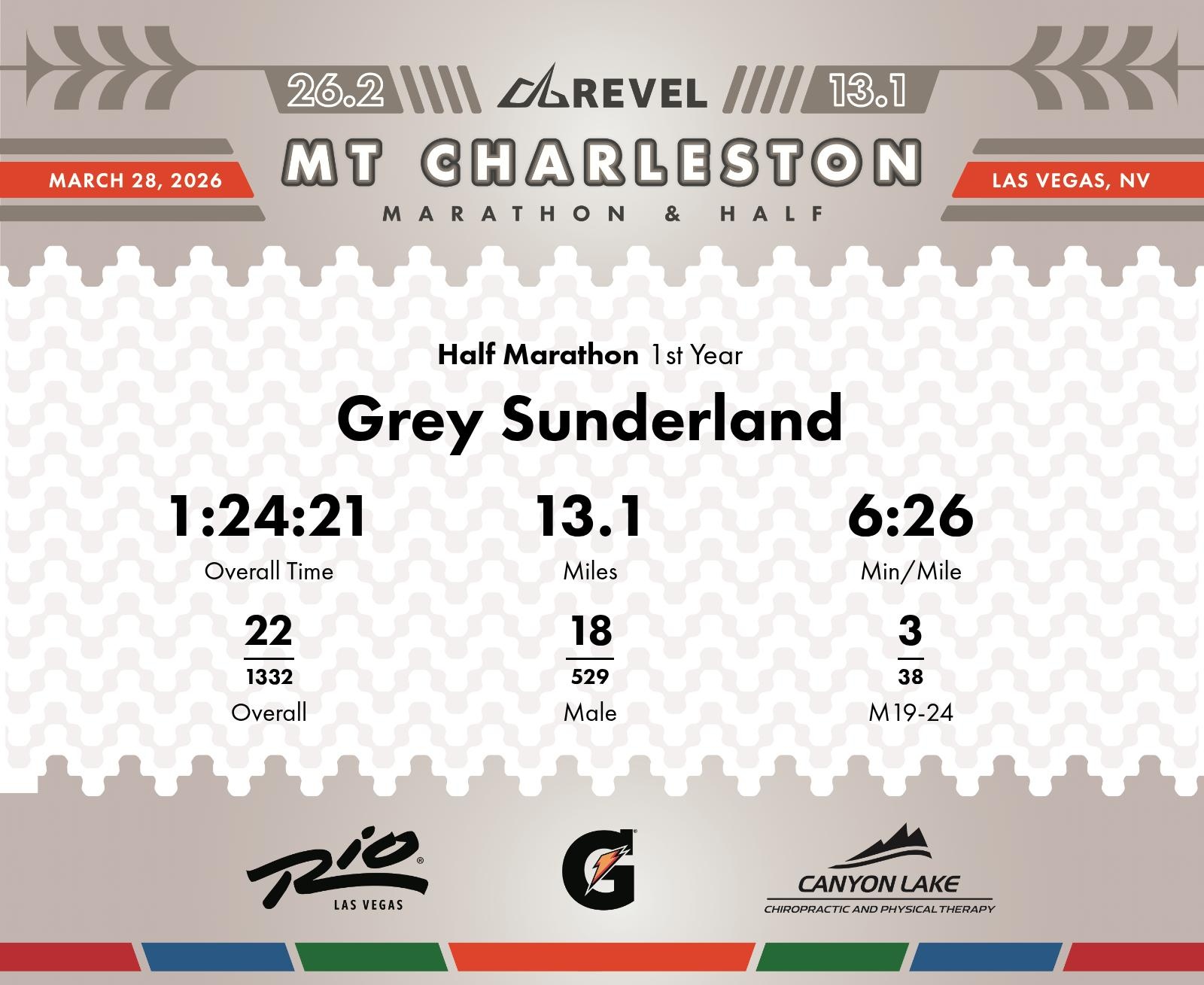 Consistent Strong Performance with Division Success Grey Sunderland delivered an outstanding performance in the 2026 REVEL Mt Charleston Half Marathon, finishing in a time of 1:24:21. Throughout the race, Grey showcased impressive consistency with an average pace of 6:26 min/mile. Notably, Grey maintained strong positioning, securing 3rd place in the M19-24 age division out of the 1542 total participants. The strategic pacing during early miles was evident with a standout split of 6:05 at mile 4, helping to solidify his top performance in his division. Overall, Grey Sunderland displayed remarkable endurance and strategy. While maintaining pace is essential, there's a minor opportunity to focus on the later race segments, such as mile 12's dip to 7:18 min/mile, to improve overall efficiency. The ability to maintain a position within the top three of the age division highlights Grey's potential for future races. Great work, Grey, with a strong performance to carry forward!