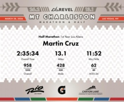 Date: March 28, 2026 Participant: Martin Cruz #4285 Race: 2026 REVEL Mt Charleston Half Marathon Distance: 13.1 miles Weather: Unseasonably warm. Nice running temperatures at the start.
