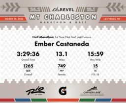 Date: March 28, 2026 Participant: Ember Castaneda #2343 Race: 2026 REVEL Mt Charleston Half Marathon Distance: 13.1 miles Weather: Unseasonably warm. Nice running temperatures at the start.