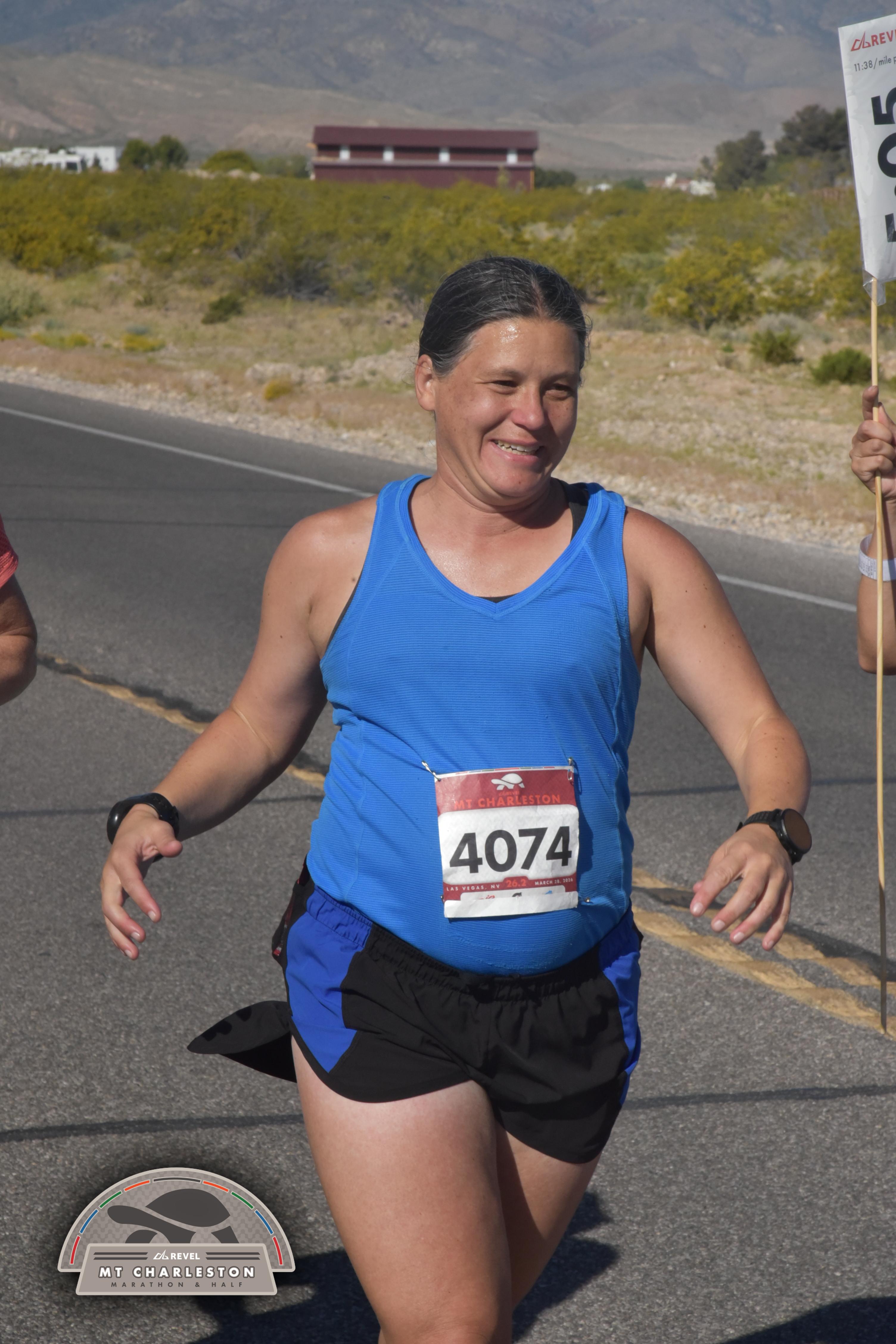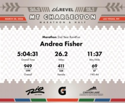 Date: March 28, 2026 Participant: Andrea Fisher #4074 Race: 2026 REVEL Mt Charleston Marathon Distance: 26.2 miles Weather: Unseasonably warm. Nice running temperatures at the start.