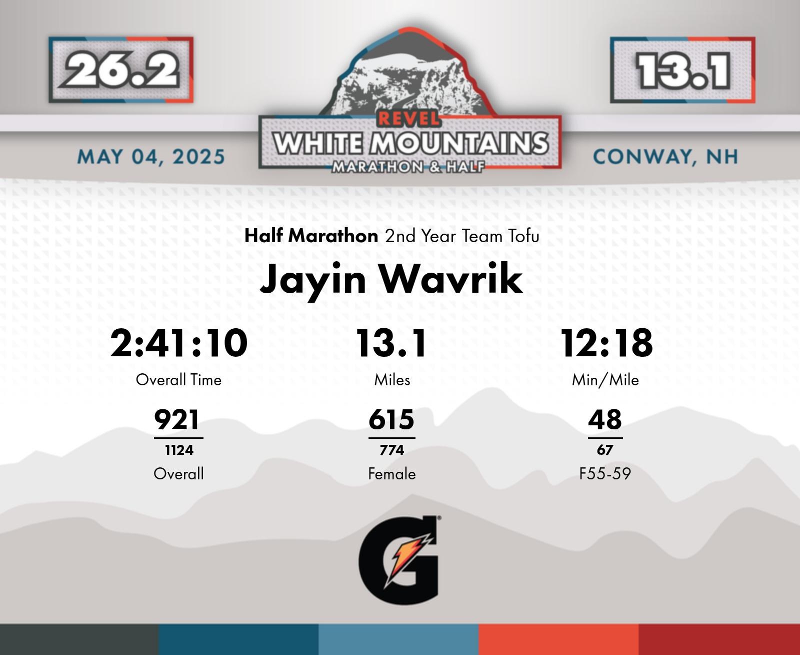 Date: May 4, 2025 Participant: Jayin Wavrik #3636 Race: 2025 REVEL White Mountains Half Marathon Distance: 13.1 miles